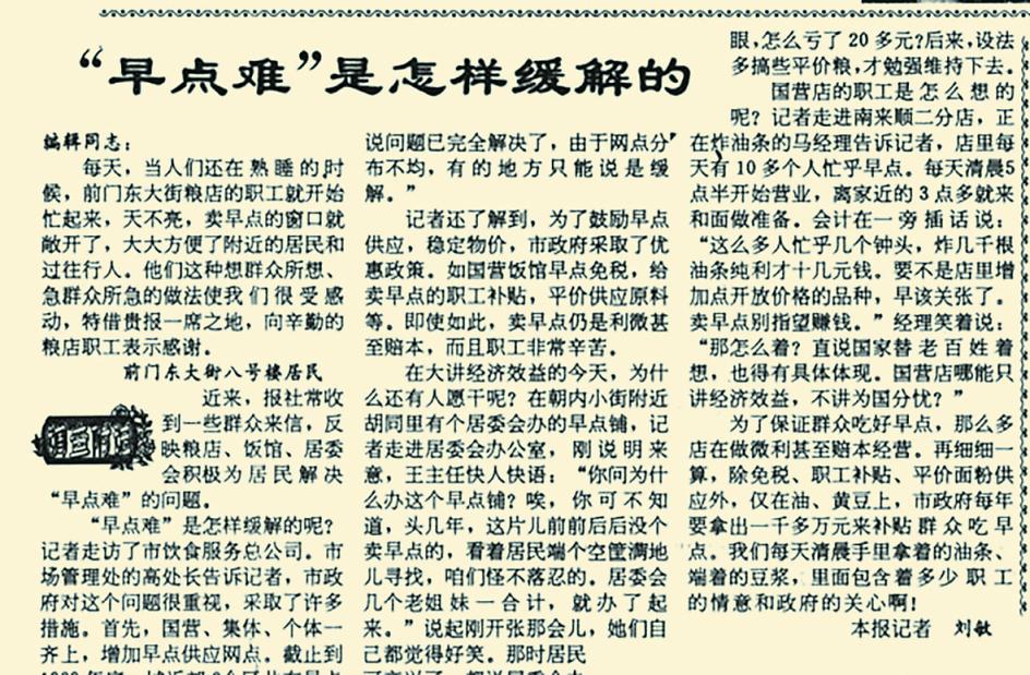 由于经营早点利微又费事,不少国有餐馆一度放弃,把精力转投在正餐上。百姓不得不去街巷中的个体早点摊,而那里又时常曝出卫生问题,何时能吃上“放心早点”又让市民犯了难。国营饭馆要不要在早点市场唱主角、吃早点难不难……一场关于早点的话题在当时甚至还引发了社会讨论。