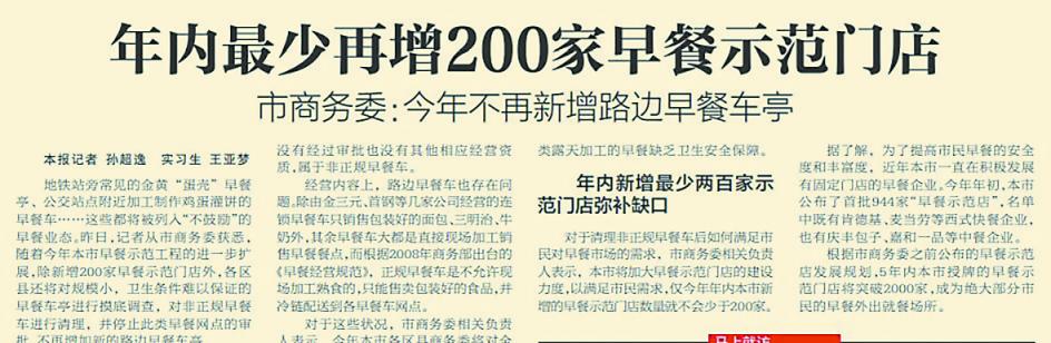 2012年初,北京首批944家“早餐示范店”亮相,名单中既有肯德基、麦当劳等西式快餐企业,也有庆丰包子、嘉和一品等中餐企业。随着早餐示范店的不断扩容,市民的早点选择也越来越安心。(2012年7月24日《北京日报》9版,《年内最少再增200家早餐示范门店》)