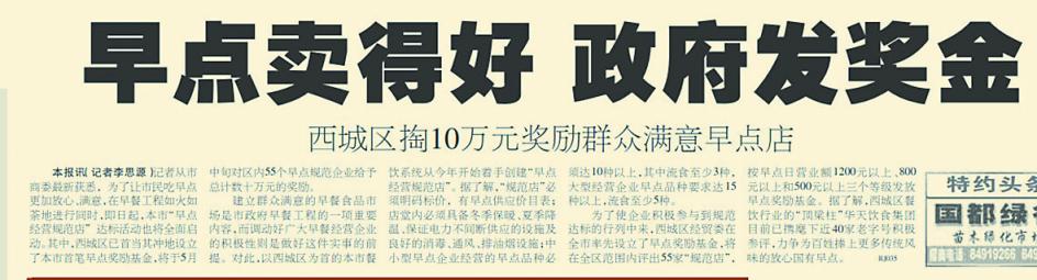 2002年,北京“早餐工程”正式启动,计划用3年左右时间让早餐经营网点走进社区,让居民步行5至10分钟就能买到早点。(2002年8月25日《北京日报》1版,《“早餐工程”正式实施》)不仅如此,为了让市民吃早点更放心,北京还启动了“早点经营规范店”达标活动。西城区设立了北京首笔早点奖励基金,对区内55个早点规范企业给予总计数十万元的奖励。(2002年4月28日《北京日报》5版,《早点卖得好 政府发奖金》)