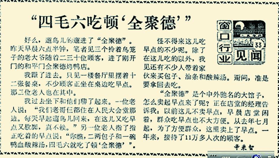 早晨6点半,和平门全聚德烤鸭店一楼餐厅里,不少居民围着桌子吃早点,还有人带着饭盒来打包包子、油条和酸辣汤。“二两包子和一碗鸭血酸辣汤,四毛六就吃了顿‘全聚德’。”一位刚遛鸟回来的老人对这顿早点很满意。(1986年7月26日《北京日报》1版,《“四毛六吃顿‘全聚德’”》)截至1986年8月,全市对外营业的62家一级饭庄中,有53家经营早点。(1986年8月12日《北京日报》1版,《本市又增百余个卖早点处》)