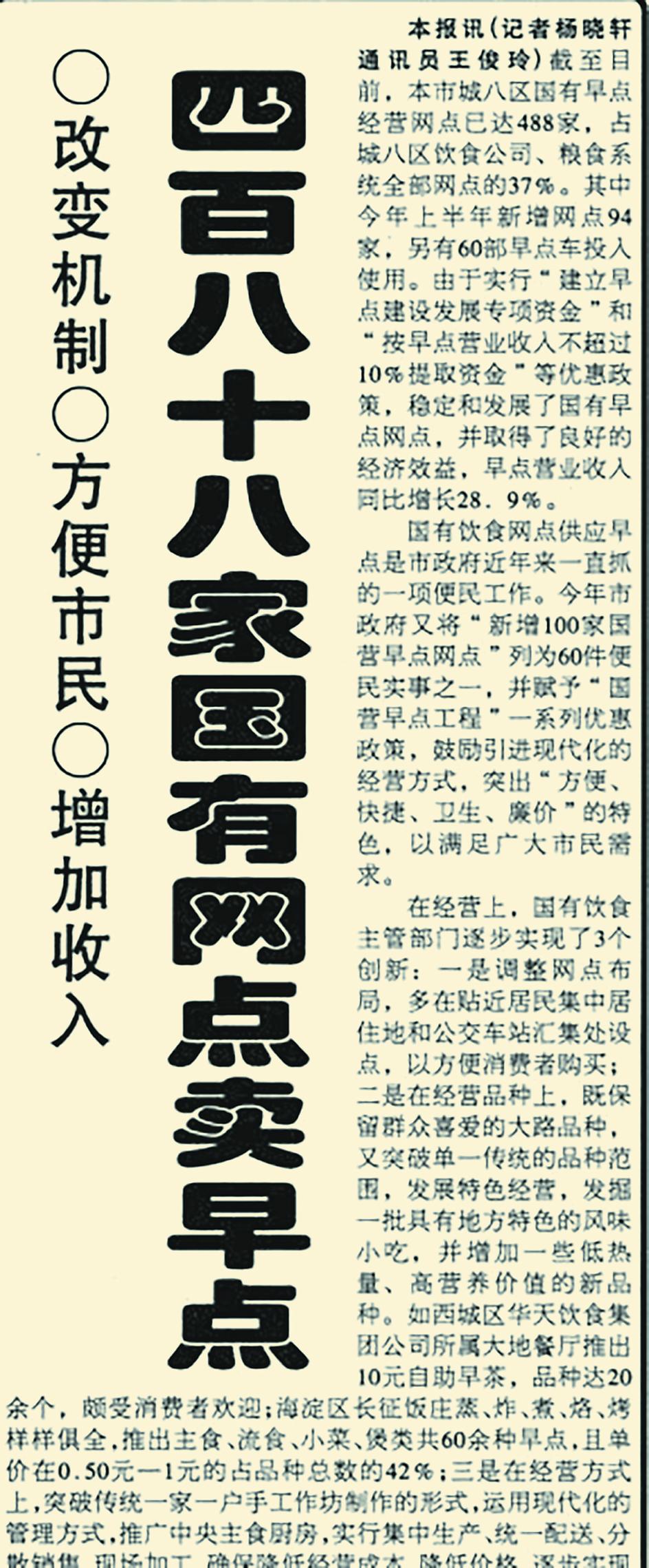 为了稳定和发展国营网点,北京实行了“建立早点建设发展专项资金”和“按早点营业收入不超过10%提取资金”等优惠政策,采取多种形式调动职工积极性。1997年,“新增100家国营早点网点”被列入政府为群众办的60件实事之一。同年,城八区国有早点经营网点达488家,占全部网点的37%,另有60部早点车在各区投入使用,解决了市民吃上放心早点的难题。更让人欣喜的是,早点经营成为餐饮行业新的经济增长点,国有餐饮企业当年早点营业收入同比增长30%。(1997年8月29日《北京日报》2版,《四百八十八家国有网点卖早点》)