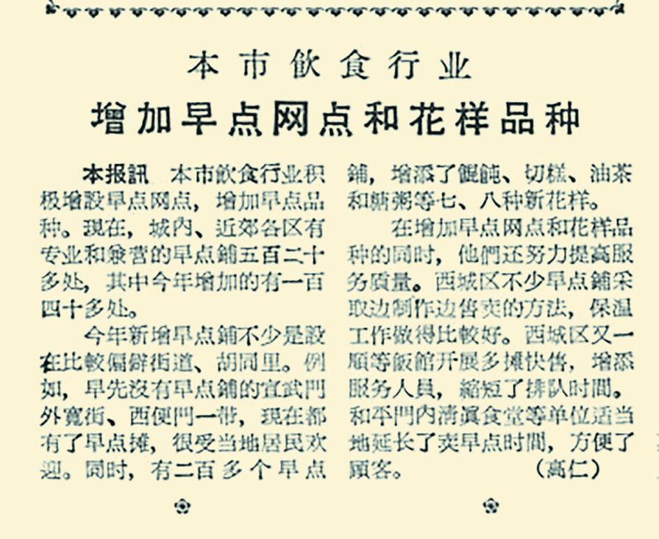 各服务行业间也伸出“援手”。像早晨业务不多的照相业、洗浴业职工,每天一大早先去早点铺帮忙,解决那里服务员不足的问题。与此同时,售卖方式也在不断改进。比如用碗盛豆浆太慢,就用壶倒;油锅小、炸货少,就改用大锅;不怕凉的食品,尽量提前多做些。面粉供应不足时,饭馆职工就设法在中午和晚上多卖米饭,面食撤下一部分当早点,或者在油饼、火烧之外,再增加一些粥、汤面、花卷、糖三角等。(1958年8月31日《北京晚报》4版,《使顾客舒适吃早点 东城区实行多项改革》)