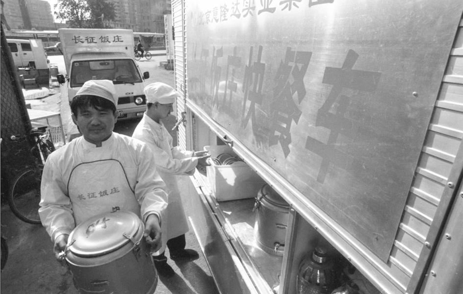 ▲1997年,海淀区政府投资购置的10辆早点快餐车将热腾腾的早点送进居民区。 张风摄