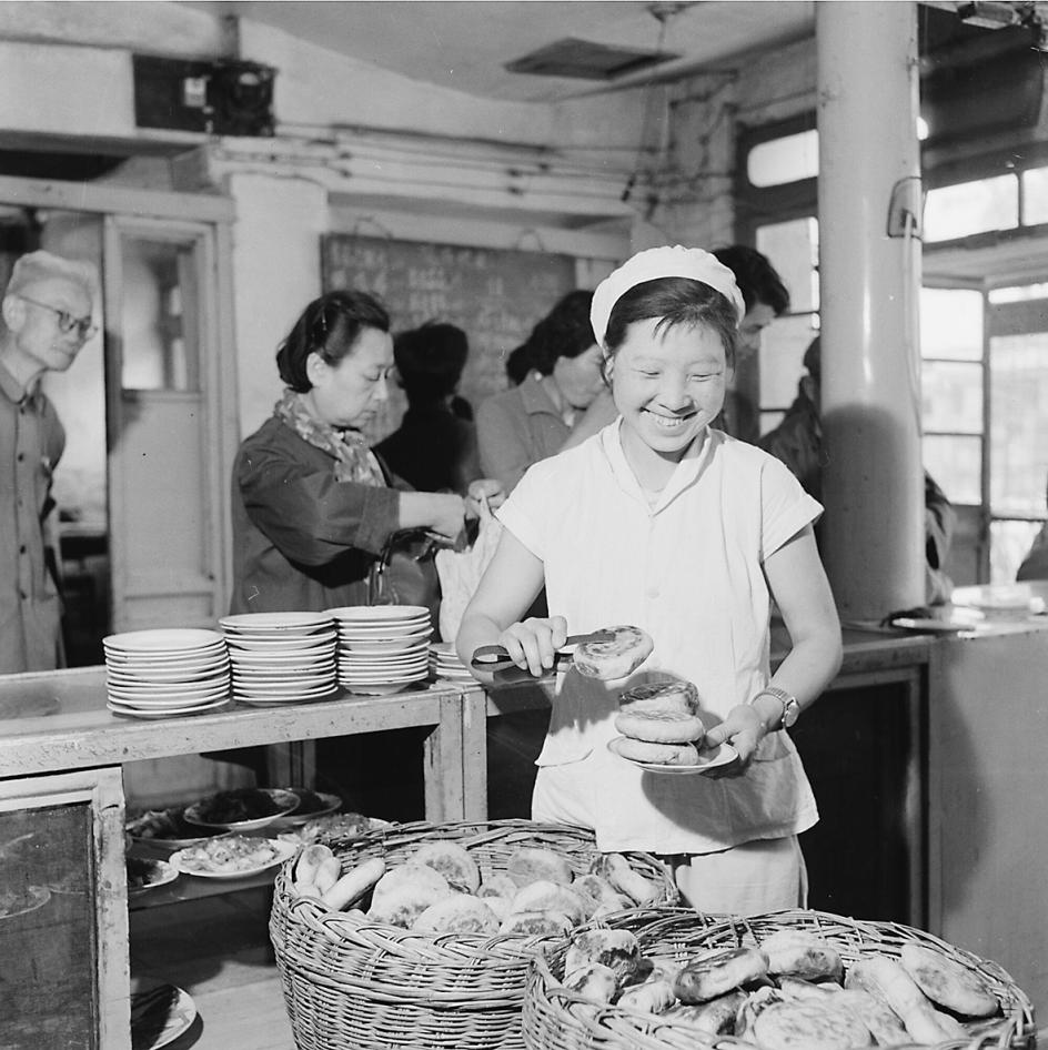 ▲上世纪五六十年代,永顺居饭馆服务员给买早点的顾客夹火烧。 高宏摄