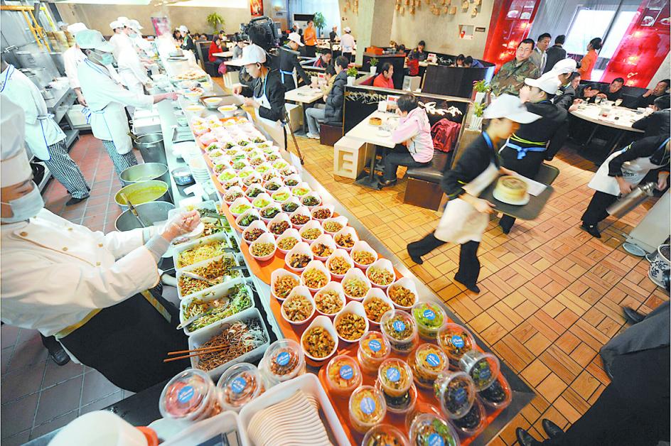 ▲2010年,眉州小吃店内,统一佩戴帽子和口罩的厨师们制作着各种早点,大厅内的座位早已坐满。 饶强摄