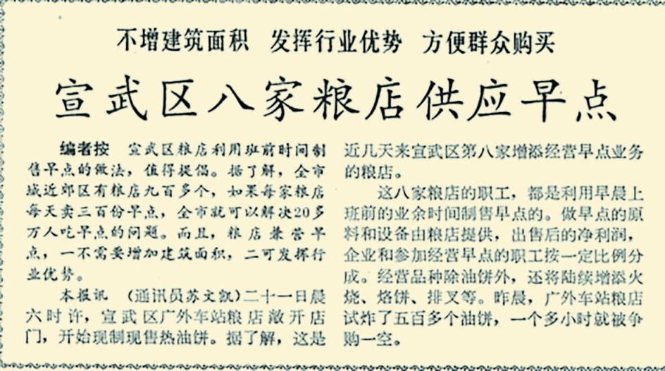 1984年,宣武区八家粮店打破过去卖生不卖熟的陈规,开始尝试“跨界”制售早点。职工利用上班前的业余时间现制现售热油饼,做早点的原料和设备由粮店提供,利润由企业和职工按比例分成。职工积极性挺高,各粮店陆续增添了火烧、油饼、麻花等品种。(1984年6月22日《北京日报》1版,《宣武区八家粮店供应早点》)不用额外增加建筑面积,就能发挥行业优势,还能方便群众,一举多得的做法很快在全市推行。到1986年,全市有420多家粮店兼营早点,每天可解决8万多人吃早点的问题。(1986年4月8日《北京日报》1版,《四百多家粮店兼营早点》)