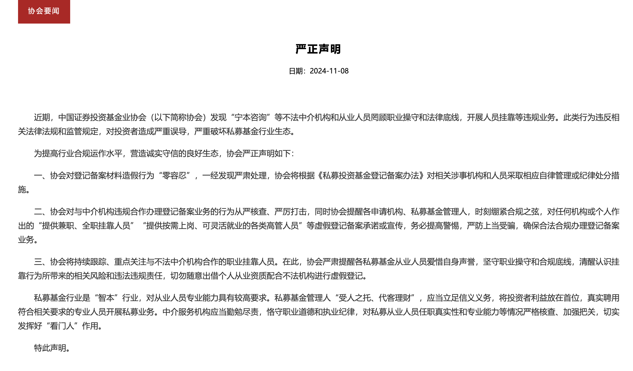 中基协:对登记备案材料造假行为“零容忍”,一经发现严肃处理中基协:对登记备案材料造假行为“零容忍”,一经发现严肃处理