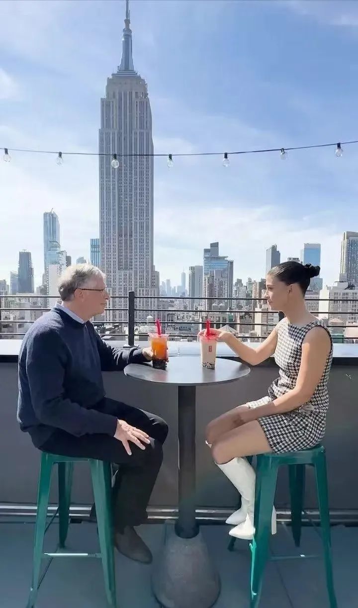 比尔·盖茨和女儿喝着中国奶茶相视而笑,而背景是高耸入云的纽约帝国大厦。