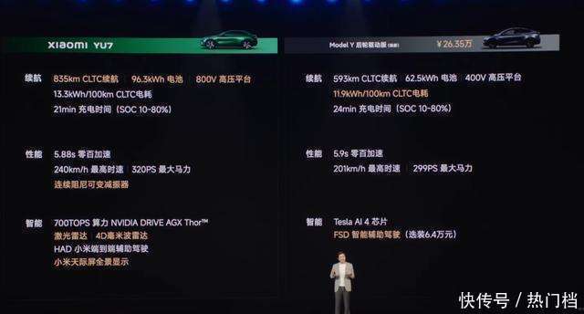 其次是充电技术。小米YU7全系标配800V高压架构,而特斯拉Model Y仍然采用400V架构。无论从哪个方面来看,小米YU7在充电性能上都占据绝对优势。在行业内常见的10%到80%充电区间,小米YU7用时21分钟,特斯拉Model Y用时24分钟。