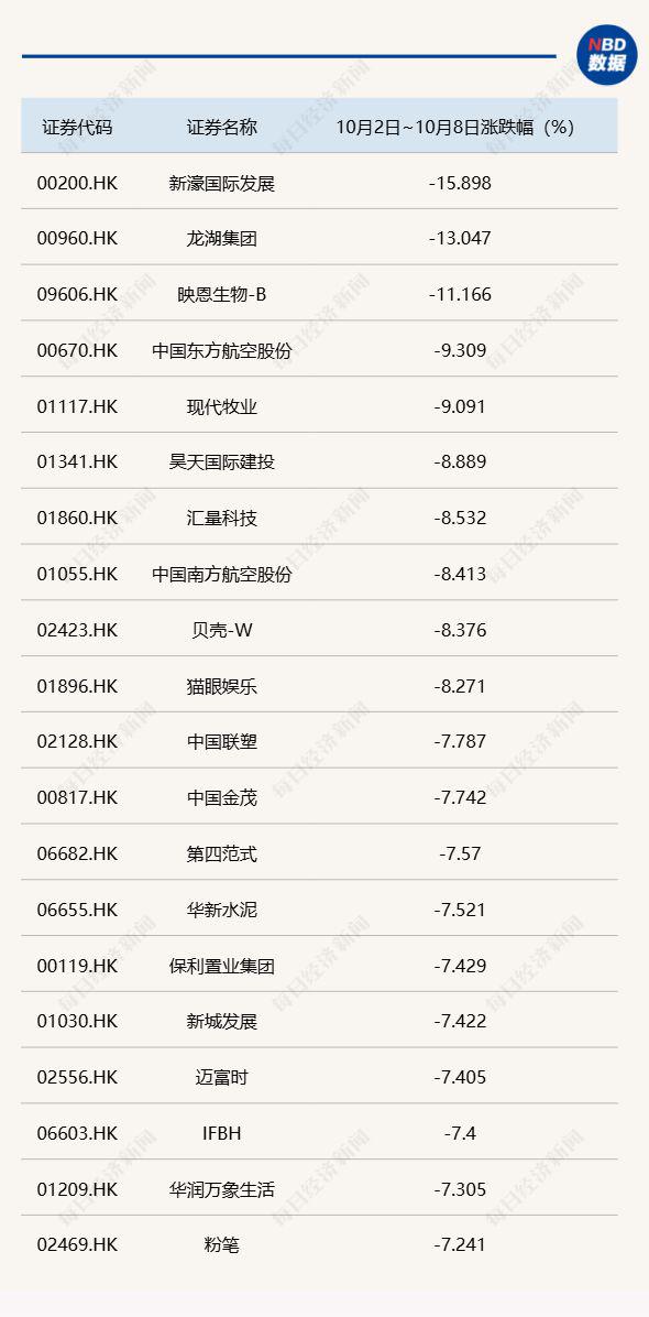 港股通标的 10 月 2 日 ~10 月 8 日累计跌幅 TOP20
