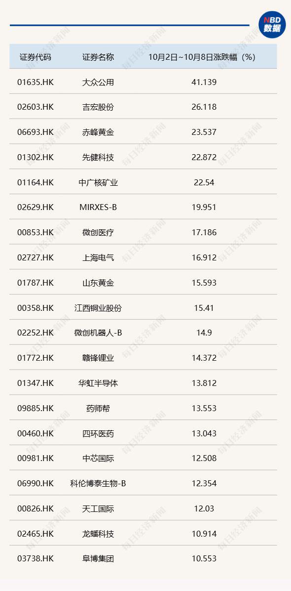 港股通标的 10 月 2 日 ~10 月 8 日累计涨幅 TOP20