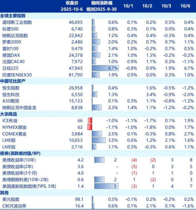 回顾长假期间全球股市,10 月 1 日 ~10 月 7 日,欧美股市普涨,同期英国富时 100 指数涨 1.4%,法国 CAC40 指数涨 1%,德国 DAX 指数涨 2.1%。美股方面,标普 500 指数涨 0.4%,纳斯达克指数涨 0.6%,道琼斯工业指数涨 0.4%。日经 225 指数、韩国综合指数分别大涨 6.7%、3.6%。国际金价、铜价也均实现上涨,但原油有所下跌。
